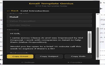 Een van de belangrijkste kenmerken is de automatische opslag van persoonlijke voorkeuren, zoals naam en functie, die door de sjablonen heen worden ingevuld. Daarnaast kunnen gebruikers sjablonen snel zoeken en hun favorieten opslaan voor eenvoudigere toegang. De extensie biedt ook de mogelijkheid om e-mailinhoud en onderwerpregels met één klik te kopiëren. Email Template Genius is ideaal voor verkoopprofessionals, freelancers en iedereen die zijn e-mailcommunicatie wil stroomlijnen, zonder dat persoonlijke gegevens het apparaat verlaten.